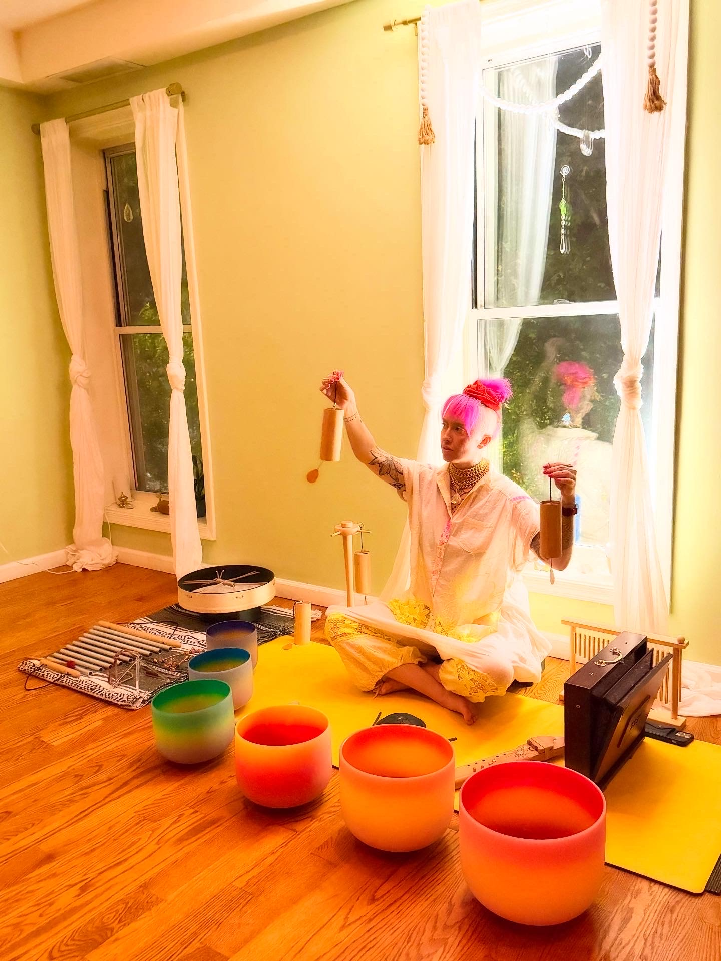 The second half of the ceremony is a restorative journey into sound. You will be guided into deeper relaxation through the vibrations of shruti, flute, crystal singing bowls, drum, harp, and other thoughtfully curated instruments. The experience concludes with a brief closing meditation and an opportunity to ask Peyton any questions.